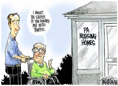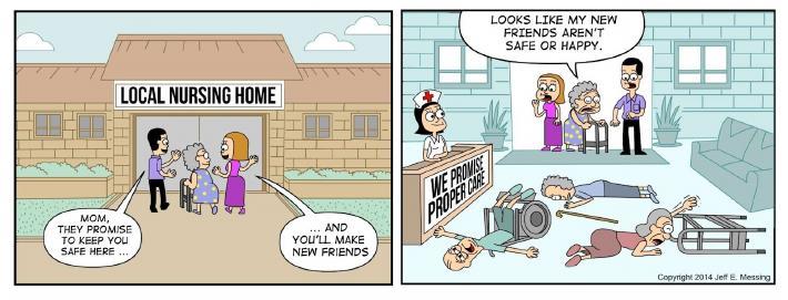 Part of the success of this horror lies in the power of deceptive verbal persuasion. Nursing homes displace the facts with cleverly fabricated false narratives. Facilities advertise good care, “Bring your loved ones here. We’ll take care of them. We have volley ball, movies, crafts, bingo, bus trips, good food. The government offers Medicare. Relax. We’re here to help”.
